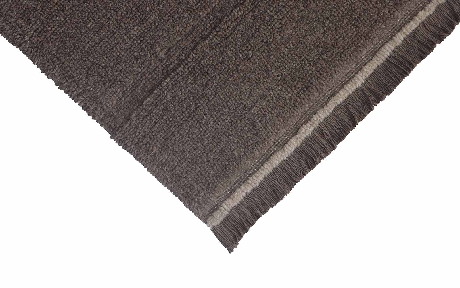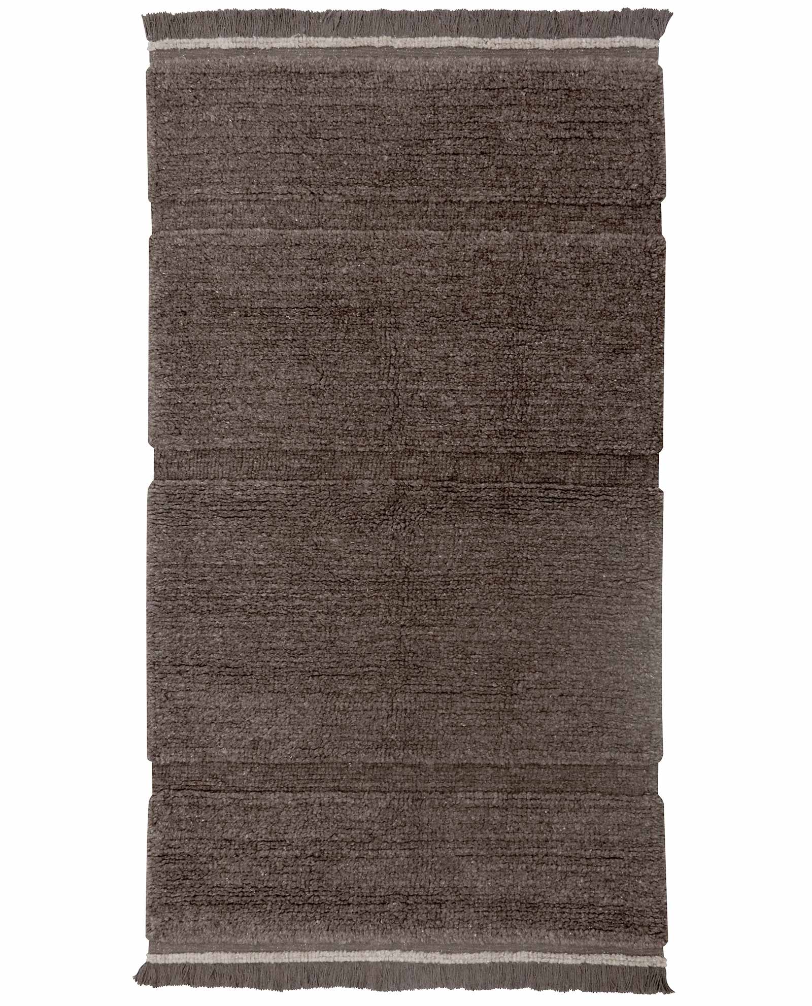 Tapis rectangulaire de Lorena Canals combinant un poil de laine doux et court avec des rangées horizontales de poils extra courts, créant un motif subtil. Finition des bords avec une ligne de couleur contrastée et de courtes franges partant de la base.
